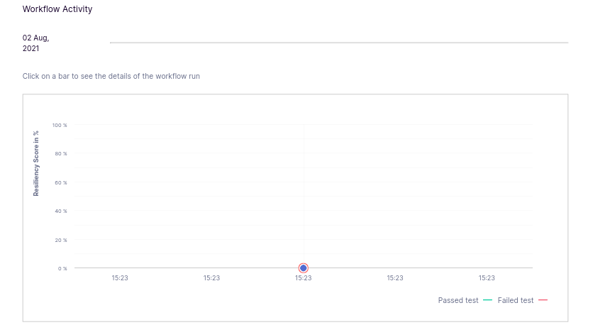 On clicking on a heat map entry, a stacked bar graph representing the pass/fail ratio is shown, on which you can see the chaos scenario runs on that day and hover over the bars to see the resiliency for that particular chaos scenario run on that day.