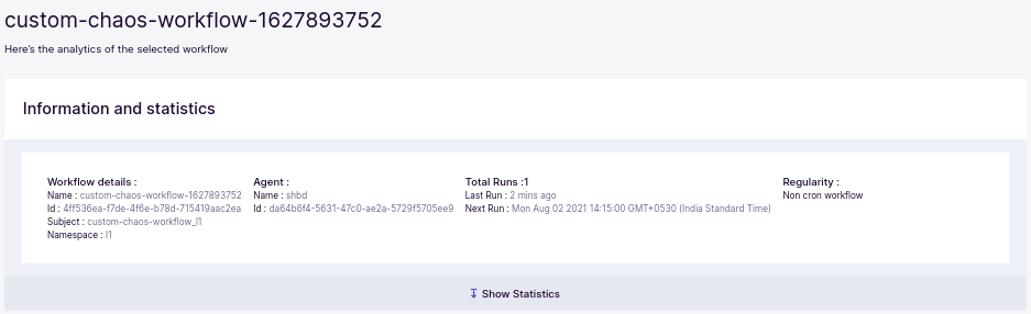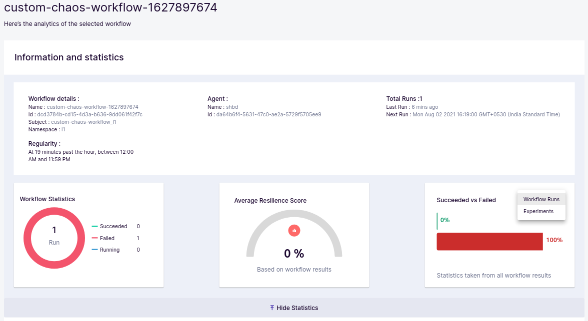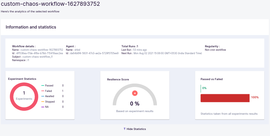 On clicking on show statistics, you will be able to see the experiment statistics, average resiliency score and pass/fail ratio for the chaos scenarios/experiments.